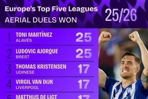 体育资讯9月12日讯 Squawka统计了本赛季球员在五大联赛的争顶成功次数,并列出榜单。 本赛季五大联赛争顶成功排名: 托尼-马丁内斯(阿拉维斯)——25 阿约克(布雷斯特)——25 托马斯-克里斯滕森(乌迪内斯)——17 范迪克(利物浦)——17 德里赫特(曼联)——17 安托万-门迪(尼斯)—...